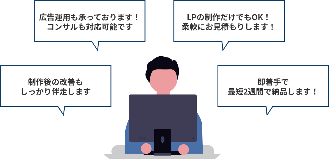 LPだけの制作も可能です。貴社で広告代理店の担当者様、広告担当者様と密に連携をとりながら制作させていただきます。お見積りも柔軟に対応いたしますので遠慮なくご相談ください。