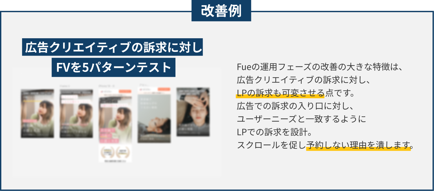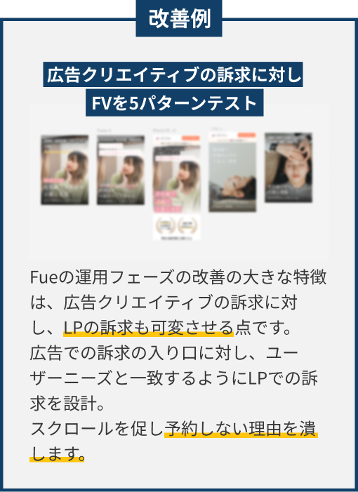 Fueは、広告→LP→予約までの“感情の流れ”を設計します。 だから、ただ読まれるだけでなく、行動(予約)につながる導線がつくれます。